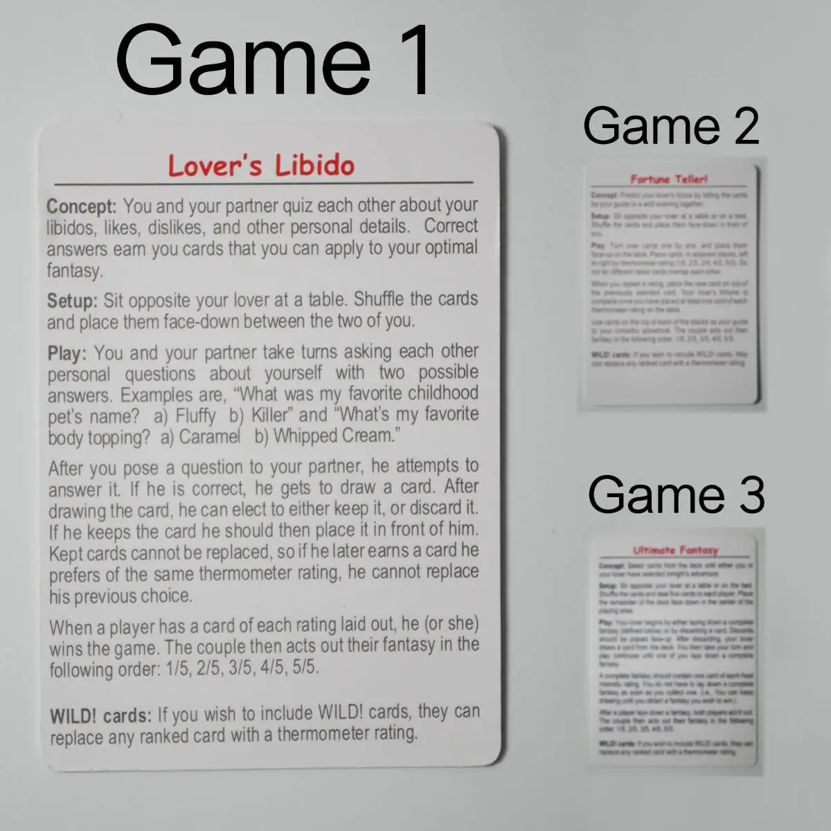 Deck includes 52 sexual position cards & 2 game cards (including rules for 3 games).
